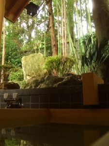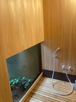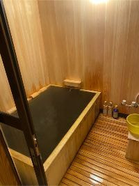 Room "Tsubaki" of the open-air bath with views of the back garden. Bathtub is made of wood Koyamaki excellent. Please spend a relaxed in the bath sink over Iwamuro Hot Springs and the smell of wood.