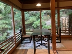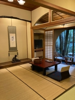 Room “HOURAI" is on the second floor overlooking the beautiful Japanese back garden. It is a room with a high ceiling can feel the traditional Japanese architecture of joinery such as window frames and the round window.